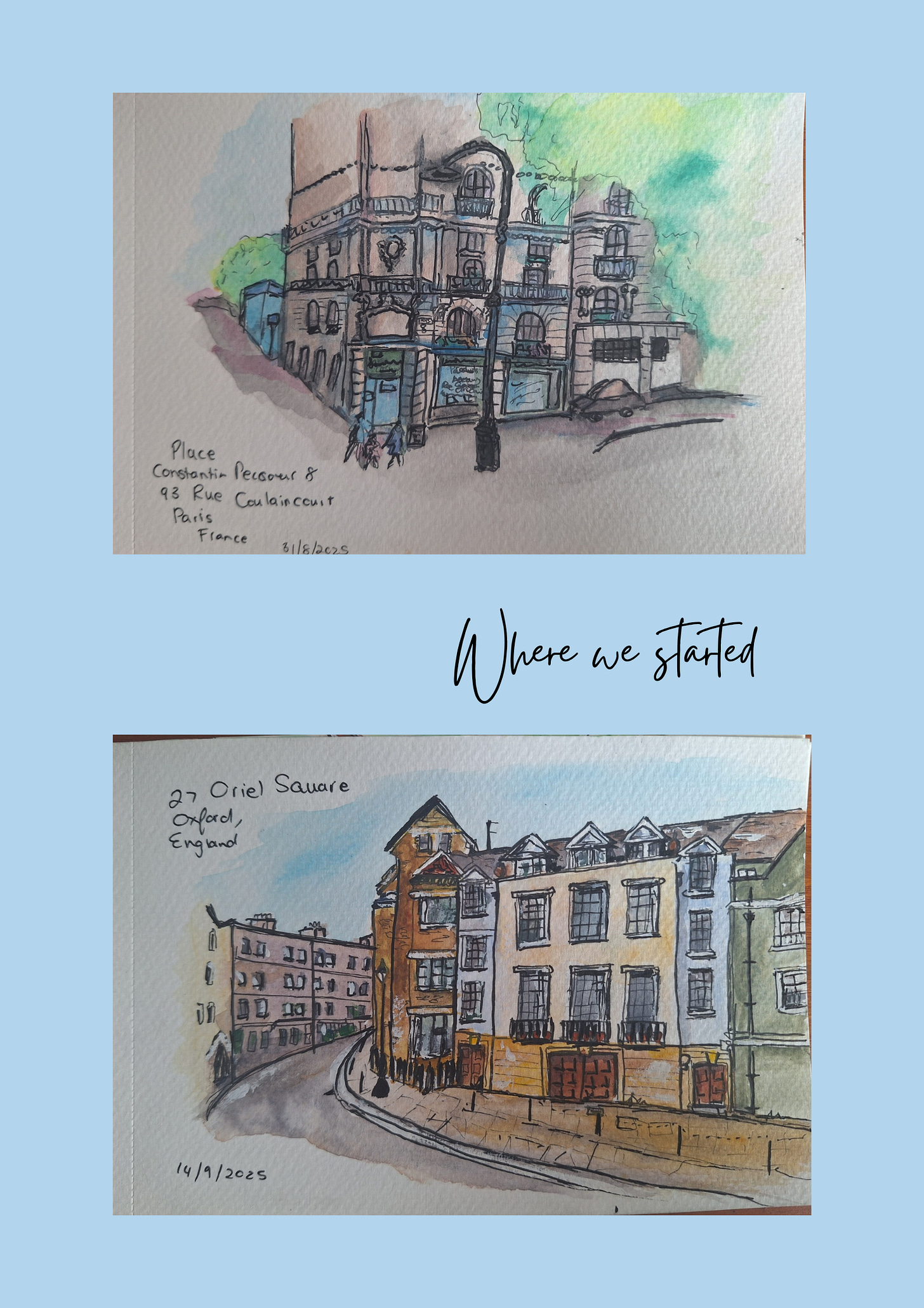 So now, every Sunday afternoon, I sit down with a homemade cappuccino, a little treat, and my sketchbook. I work on my ink and watercolour urban sketching, a format that draws me in completely. It’s challenging enough to keep me curious, and meditative enough to feel like therapy.